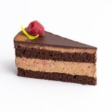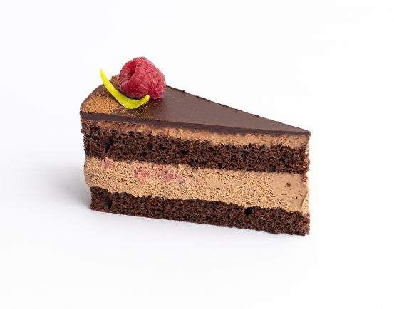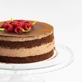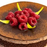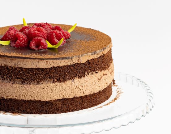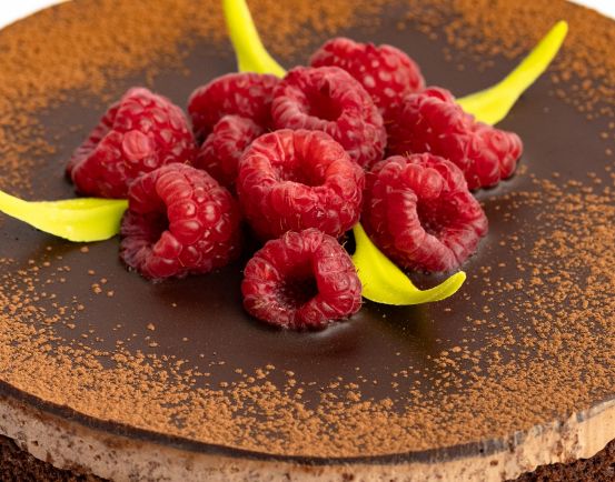 Čokoládová torta s parížskym krémom a čerstvými malinami na kakaovom korpuse bez lepku.