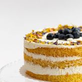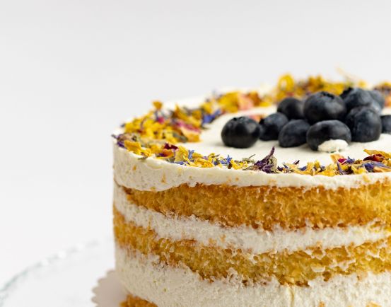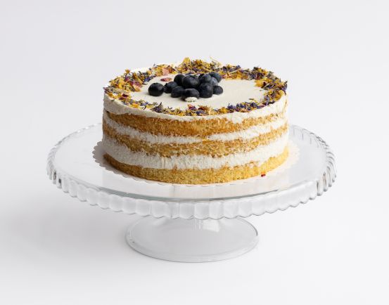 Svieža torta s mangovým pyré a mascarpone krémom na kokosovom korpuse bez lepku. Zdobená sušenými kvetmi a čerstvými čučoriedkami.