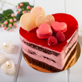 Zloženie: múka, cukor, vajcia, soľ, kakao, sóda bikarbóna, prášok do pečiva, mascarpone, šľahačka, malinové pyré, čokoláda