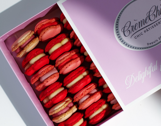 Zloženie: mandľová múka, vajcia, cukor, potravinárske farbivo, smotana na šľahanie, belgická čokoláda, soľ