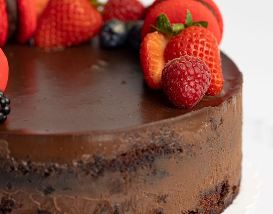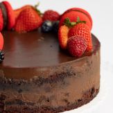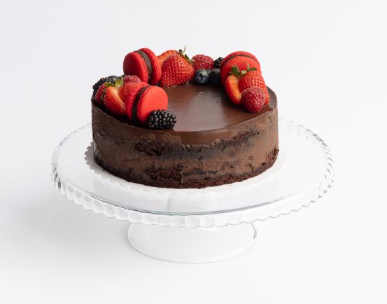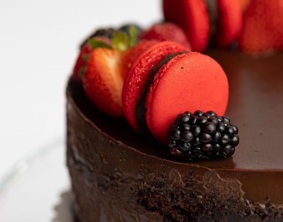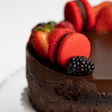 Čokoládová torta pre milovníkov čokolády zdobená čerstvým ovocím a makrónkami. Farba makroniek sa môže líšiť ako aj druh ovocia.